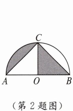 2. 如图,以 $ AB $ 为直径,点 $ O $ 为圆心的半圆经过点 $ C $,若 $ AC = BC = \sqrt{2} $,则图中阴影部分的面积是(