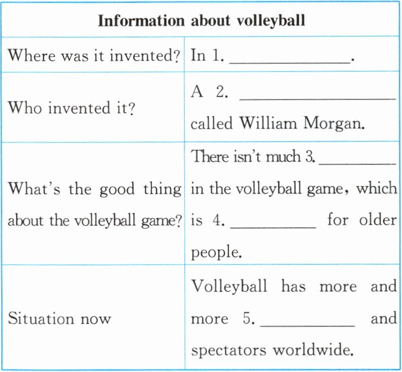 |What's the good thing about the volleyball game?|There isn't much 3. ______ in the volleyball game, which is 4. ______ for older people.|