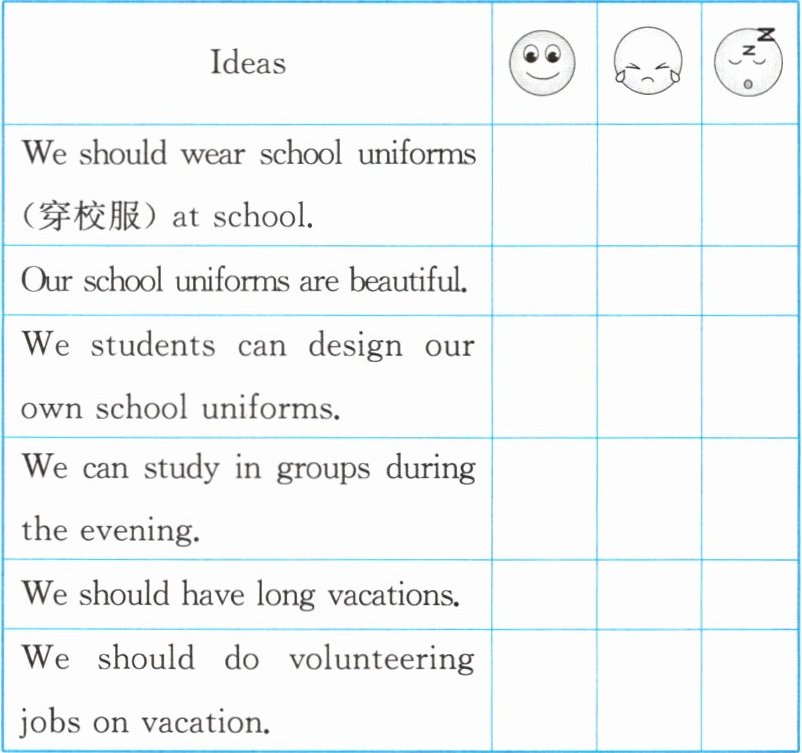 | We should wear school uniforms(穿校服)at school. | √ (Agree. School uniforms can create a sense of unity and reduce distractions.) | | |