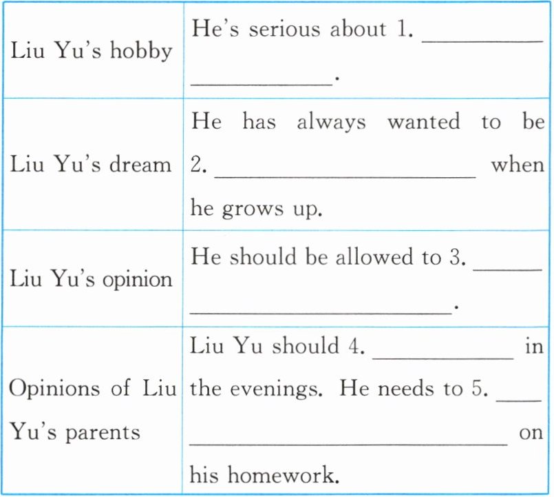 | Opinions of Liu Yu's parents | Liu Yu should 4. ______ in the evenings. He needs to 5. ______ on his homework. |