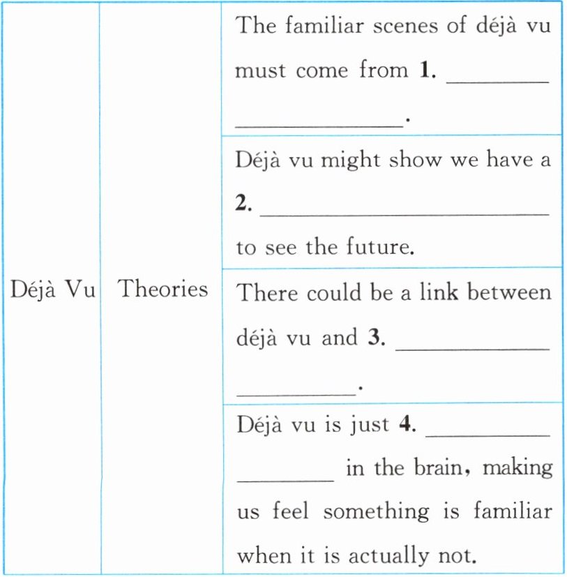 | Déjà Vu | Theories | The familiar scenes of déjà vu must come from 1. ______. |