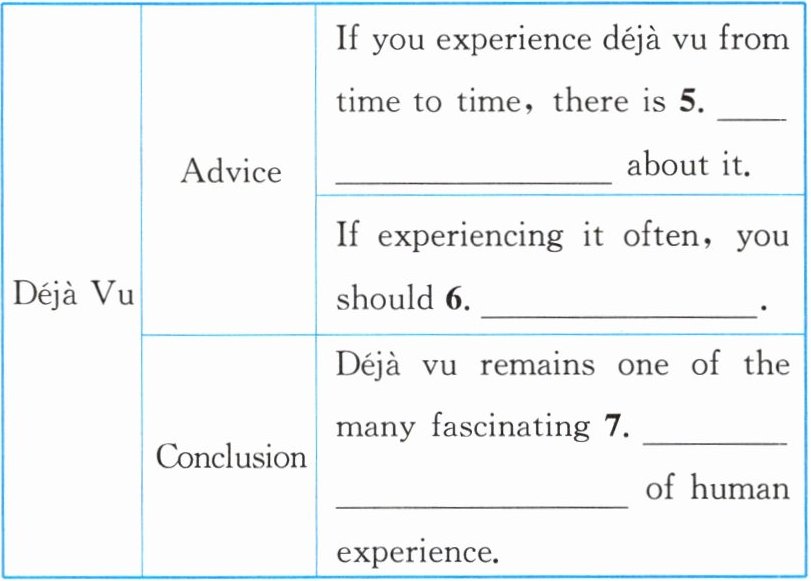 | | Conclusion | Déjà vu remains one of the many fascinating 7. ______ of human experience. |