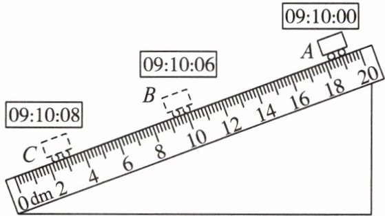 2. 小华用右图所示实验装置测量小车运动的平均速度。实验中,他们将小车从带刻度(分度值为2cm)的斜面顶端$A$点由静止释放,并同时按下电子秒表开始计时,图中方框内显示了小车位于$A$、$B$、$C$三点的时刻(数字表示“时:分:秒”)。
