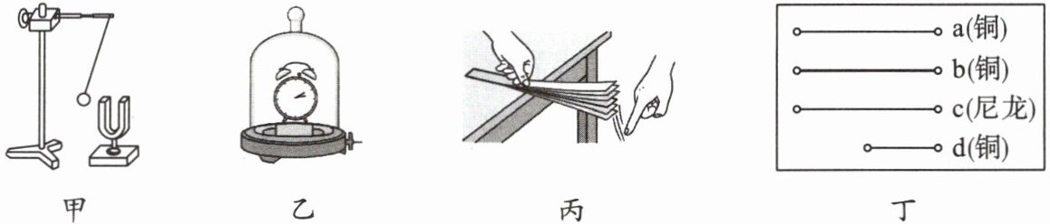 (选填“响度”“音调”或“音色”)会发生改变。(4) 某研究小组利用两个纸杯和一些长短、粗细不同的琴弦,又进行了探究音调与哪些因素有关的活动。他们选用的琴弦长度、材料在图丁中已标出(其中琴弦的直径关系是琴弦a、c、d的直径相同且都小于琴弦b的直径),并且每根琴弦固定在“音箱”上的松紧程度一致。为了研究音调高低与琴弦粗细的关系,应该选择琴弦
