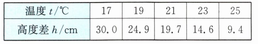 如图所示,某小组同学利用小塑料瓶、细管、软木塞、水槽等制作了一个简易的伽利略温度计,并利用它测出了不同温度下细管内外液面的高度差h。测量数据记录在下表中。