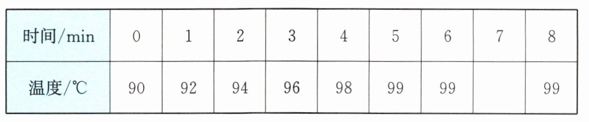 $^{\circ}C$。(3)在水温升高到 $90^{\circ}C$ 后,小明每隔 $1$ min 观察 $1$ 次温度计的示数,记录在表中,直到水沸腾。沸腾持续 $3$ min 后停止读数。