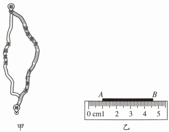 9. 图甲是某地图软件上南昌到瑞金的一段公路线,小明用细线沿此图上公路线截取相同一段,拉直后的长度如图乙中线段AB所示。