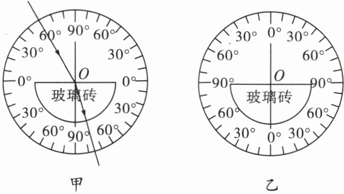 [进行实验]$30^\circ$[分析论证]2、3、4 增大 1、2、5 正确[交流评估]乙 入射角和折射角解析 [进行实验]图甲中,入射光线与法线的夹角就是入射角,为$90^\circ - 60^\circ = 30^\circ$。[分析论证]由题表中数据可得,要验证折射角大小与入射角大小有关,应控制介质种类不变,改变入射角大小,根据序号2、3、4可以得出光从空气斜射入某种透明介质中时,折射角随入射角的增大而增大。要验证折射角大小与介质种类有关,应控制入射角不变,改变介质种类,分析比较实验序号1、2、5数据可得,光从空气斜射入水、透明树脂、重火石玻璃中,当入射角一定时,折射角都不同,说明猜想二正确。[交流评估]比较题中甲、乙两图发现题图甲法线指向$90^\circ$,而题图乙法线指向$0^\circ$,所以题图乙更方便地测出入射角和折射角。