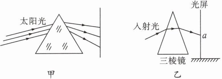 8. 一束阳光照射到三棱镜后出现的情况如图甲所示。好奇的小明将阳光改成红光仍然沿原来的方向照射到三棱镜上(如图乙所示),在光屏上a点处形成一个红色光斑。现保持入射光位置、方向及三棱镜位置不变,仅将红光改为紫光,下列说法正确的是(