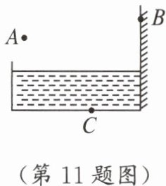11. 如图所示,小羽家墙角有一鱼缸,盛了一部分水,小羽用激光笔从$A$点射向水面,在缸底$C点和墙上B$点照出两个光斑,请帮小羽完成激光笔射出的光形成光斑的光路图。