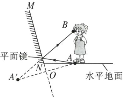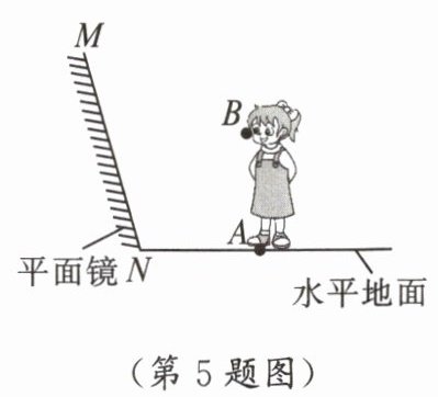 5. 如图所示,女孩到鞋店去买鞋,她站在镜子$MN$前看自己穿着新鞋的效果。画出女孩眼睛$B点看到新鞋A$点在平面镜中所成像的光路图。