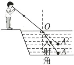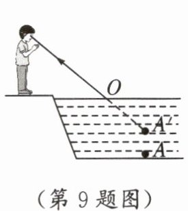 9. 在防溺水教育活动中,老师告诉学生,池塘里水的实际深度比看起来要深,不能贸然下水游泳。下图是解释这一现象的情境,$A$处有一物体,$A'$是岸边儿童看到该物体的像。请作出过$O$点的入射光线,并标出入射角。