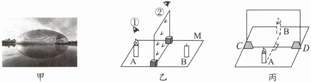 的位置。(2)如图乙所示,将玻璃板垂直于水平桌面放置,将点燃的蜡烛A放在玻璃板前,小明拿未点燃的蜡烛B在玻璃板后移动,按照图中方式