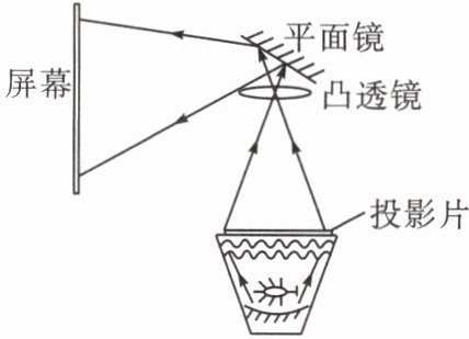 C 解析 投影仪中的平面镜可以将透镜会聚的光反射到屏幕上,起到改变光的传播方向的作用,故A正确。屏幕表面做得粗糙,这样光可以在其表面发生漫反射,能够让各个方向的人看到屏幕上的像,故B正确。投影仪的镜头是一个凸透镜,在屏幕上所成的像为倒立、放大的实像,故C错误。若使屏幕上的像变大,应减小物距,则应使镜头靠近投影片,故D正确。
