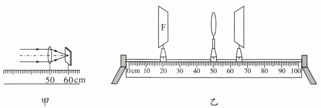 上。(3) 当凸透镜、光屏和发光二极管 $ F $ 的位置如图乙所示时,光屏上能成一清晰的像,则该像是倒立、
