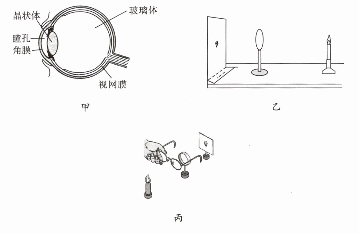 7. 图甲为眼球结构示意图,图乙为某同学模拟眼球成像原理的实验装置示意图,则模拟成像实验中的凸透镜相当于眼球的