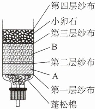 (3)题干中所给的小卵石、石英砂都是起过滤作用,过滤应由粗到细,先用小卵石过滤掉颗粒比较大的杂质,再用石英砂过滤掉颗粒比较小的杂质,所以 B 层最好放石英砂,A 层放置的材料是活性炭,除去水中的色素和异味。