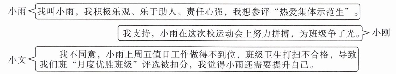 小文<我不同意,小雨上周五值日工作做得不到位,班级卫生打扫不合格,导致我们班“月度优胜班级”评选被扣分,我觉得小雨还需要提升自己。