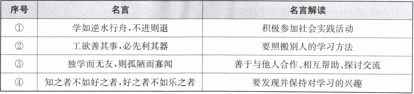 D 解析“学如逆水行舟,不进则退”的意思是,学习要不断进取、不断努力,就像逆水行驶的小船,不努力向前,就只能向后退,这与积极参加社会实践活动无关,①排除;“工欲善其事,必先利其器”说明要掌握科学的学习方法,找到适合自己的学习方法,不能照搬别人的学习方法,②错误;“独学而无友,则孤陋而寡闻”说明要善于与他人合作、相互帮助、探讨交流,③正确;“知之者不如好之者,好之者不如乐之者”说明要发现并保持对学习的兴趣,④正确。