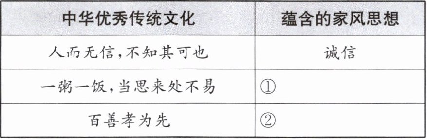 (1)我国自古以来就重视家风建设,中华优秀传统文化中蕴含着良好的家风思想。请你参与完成下表。