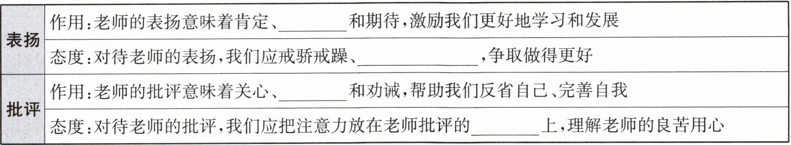 | | 作用:老师的表扬意味着肯定、______和期待,激励我们更好地学习和发展 |