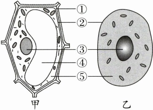 16. 实验课上老师让同学们用两种实验材料制作临时装片观察细胞结构,一种是自身的口腔上皮(A),一种是洋葱鳞片叶(B),其中不含叶绿体。小唐严格按照要求做好了两个临时装片,在显微镜下分别观察到图甲、图乙所示的细胞。请据此分析并回答下列问题。