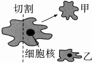 7. 科学家用单细胞动物变形虫做了右图所示的切割实验,将变形虫切割成了两部分,一段时间后,发现甲部分死亡,乙部分继续长成一只变形虫。这个实验说明,指导生物生长发育的信息主要储存在( )