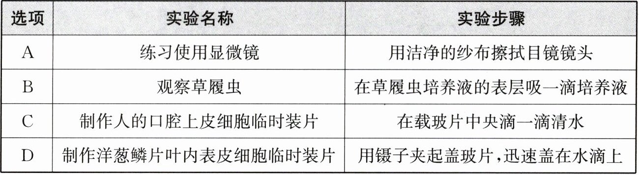 B 解析 显微镜的目镜镜头要用擦镜纸擦拭,A项错误。制作人的口腔上皮细胞临时装片时,应该在载玻片中央滴一滴生理盐水,C项错误。制作洋葱鳞片叶内表皮细胞临时装片过程中,盖盖玻片时,用镊子夹起盖玻片,使它的一边先接触载玻片上的水滴,然后缓缓放下,D项错误。