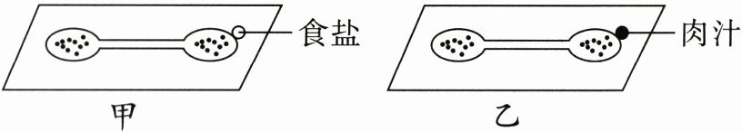 8. 为了探究草履虫能否对外界刺激作出反应,某同学做了这样一个实验(如下图所示):在甲、乙两块载玻片两端各滴一滴草履虫培养液,并把两滴培养液连通,然后在甲载玻片右侧培养液边缘放一小粒食盐,在乙载玻片右侧培养液边缘滴一滴肉汁。下列相关叙述错误的是( )