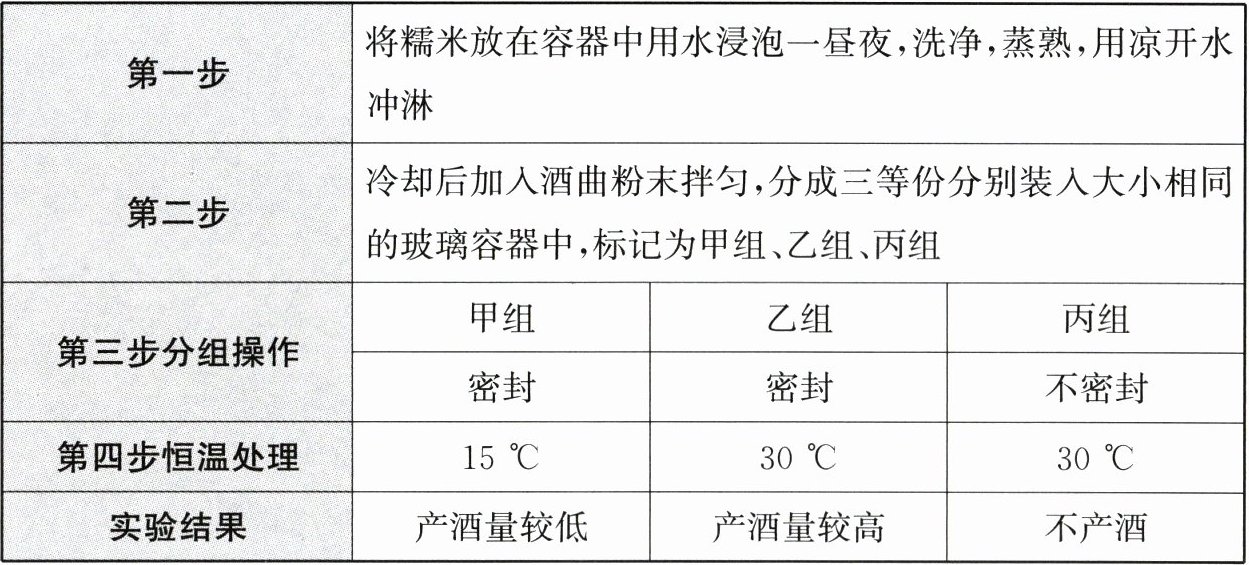 15. 一名同学在酿制米酒过程中发现,用等量糯米酿酒,产酒量却不同,且有的同学酿制失败没有产酒。为了弄清楚原因,他们设计了如下实验,请回答下列问题。