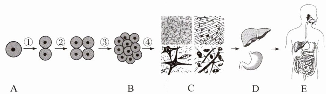 (填细胞的生理活动)。(4) 图中 C 表示的结构层次是