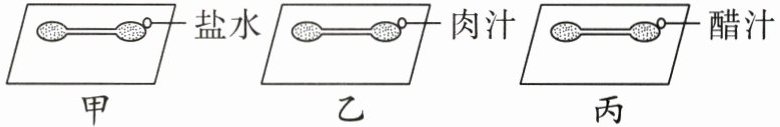 实验方案:①取甲、乙、丙三个载玻片(如下图所示),分别在其两端各滴一滴草履虫培养液,并使其相互连通;②在甲、乙、丙三个载玻片右侧培养液边缘分别滴一小滴高浓度盐水、肉汁、醋汁;③用显微镜观察发生的现象,分析并得出结论。