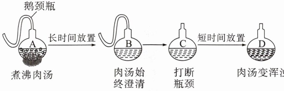 (2)打断瓶颈后,空气中的细菌、真菌等微生物进入肉汤,并大量繁殖,使肉汤变质。