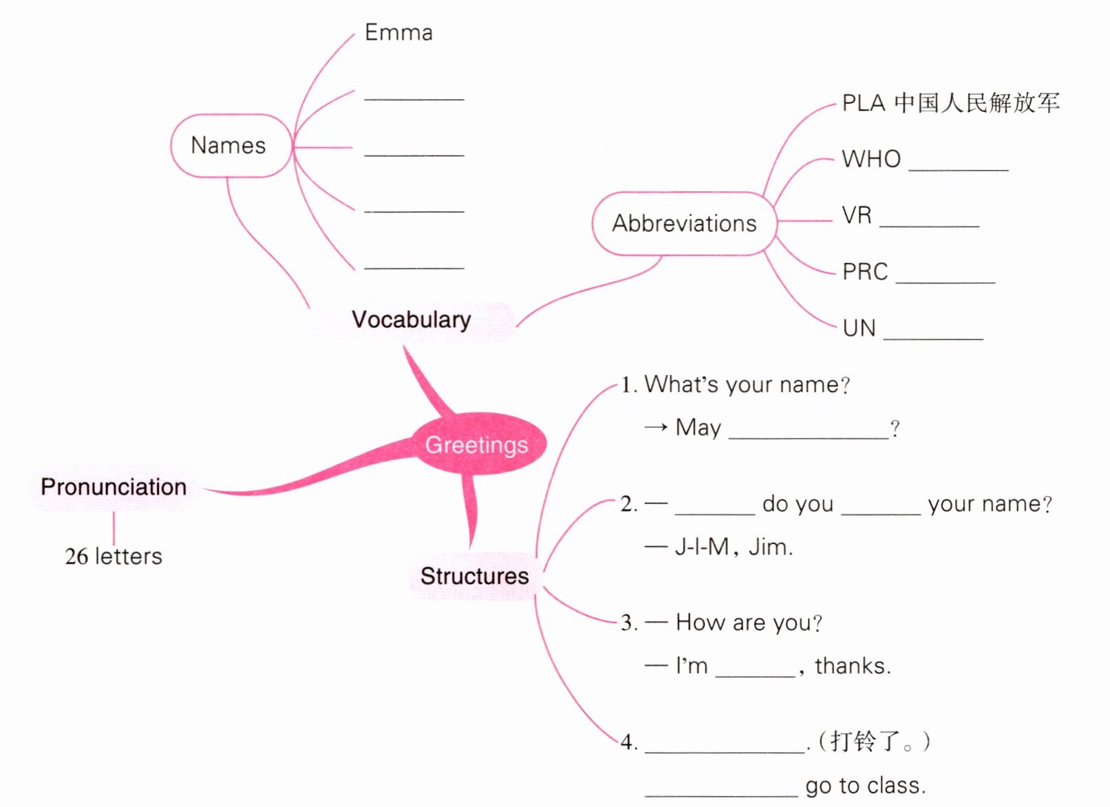 Names: Tom, Gina, Bob, Alice; Abbreviations: WHO-世界卫生组织, VR-虚拟现实, PRC-中华人民共和国, UN-联合国; Structures: 1.I know your name; 2.How, spell; 3.fine; 4.The bell is ringing, Let's