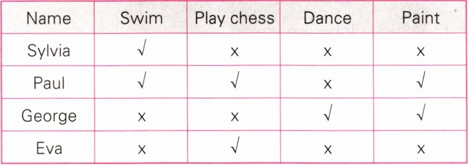 Ⅲ. 下面表格中的符号×表示该同学不会这个项目,符号√表示会。请根据表格信息完成句子。