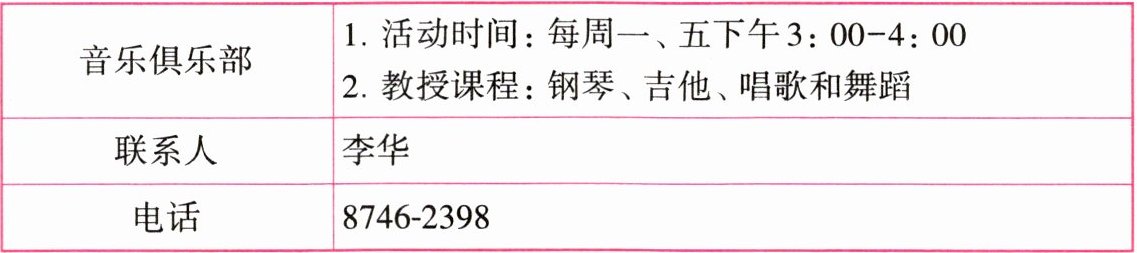 李华在一所国际学校读书。新学期开学之际,作为音乐俱乐部的负责人,他忙于招募新成员,现在想委托你根据下表帮他做一张海报张贴在学校公告栏,以鼓励同学们踊跃加入音乐俱乐部。
