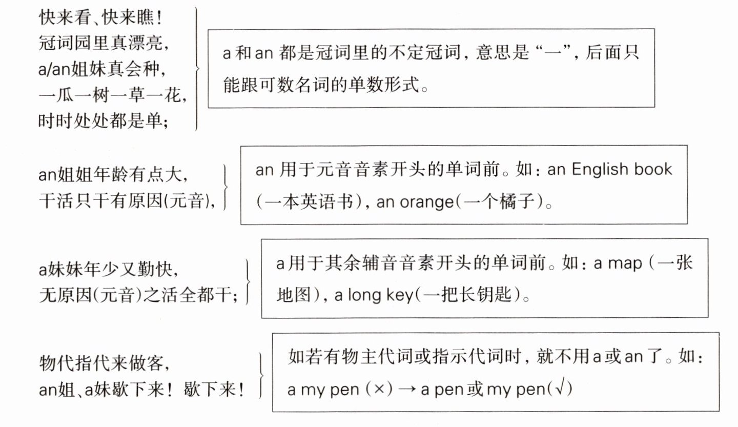 a和an是不定冠词,意为“一”,后接可数名词单数;an用于元音音素开头的单词前,a用于辅音音素开头的单词前;有物主代词或指示代词时不用a/an。
