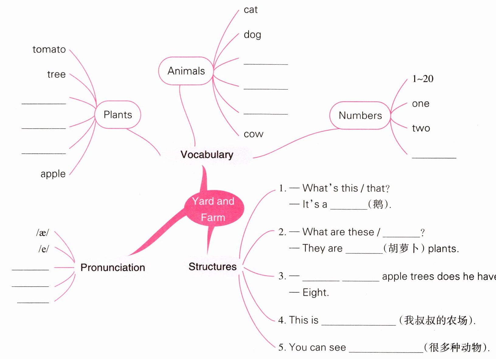 Plants: flower, grass, potato; Animals: pig, duck, chicken; Numbers: three; Pronunciation: cat, bed, pig; Structures: 1. goose; 2. those, carrot; 3. How many; 4. my uncle's farm; 5. many kinds of animals