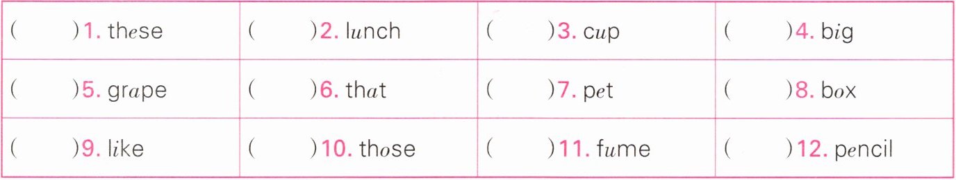 1. (/iː/) 2. (/ʌ/) 3. (/ʌ/) 4. (/ɪ/) 5. (/eɪ/) 6. (/æ/) 7. (/e/) 8. (/ɒ/) 9. (/aɪ/) 10. (/əʊ/) 11. (/juː/) 12. (/e/)