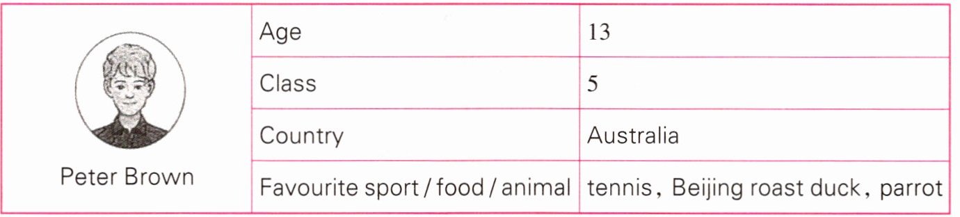 | | Favourite sport/food/animal:tennis,Beijing roast duck,parrot |