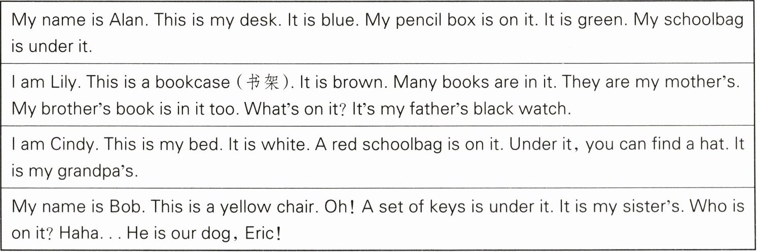 |My name is Alan. This is my desk. It is blue. My pencil box is on it. It is green. My schoolbag is under it.|