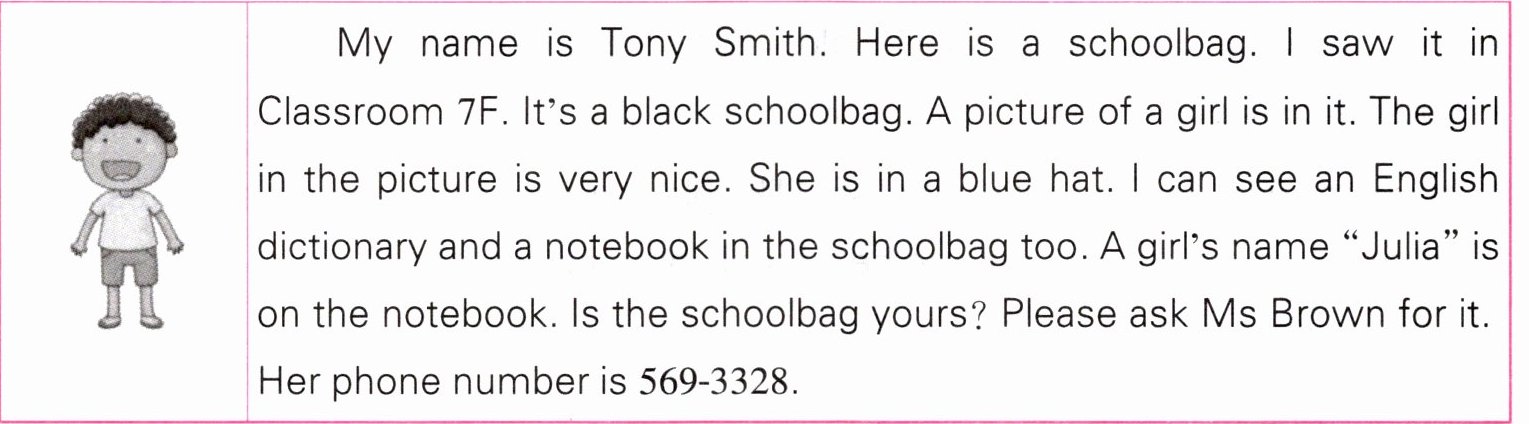 | | My name is Tony Smith. Here is a schoolbag. I saw it in Classroom 7F. It's a black schoolbag. A picture of a girl is in it. The girl in the picture is very nice. She is in a blue hat. I can see an English dictionary and a notebook in the schoolbag too. A girl's name “Julia” is on the notebook. Is the schoolbag yours? Please ask Ms Brown for it. Her phone number is 569 - 3328. |