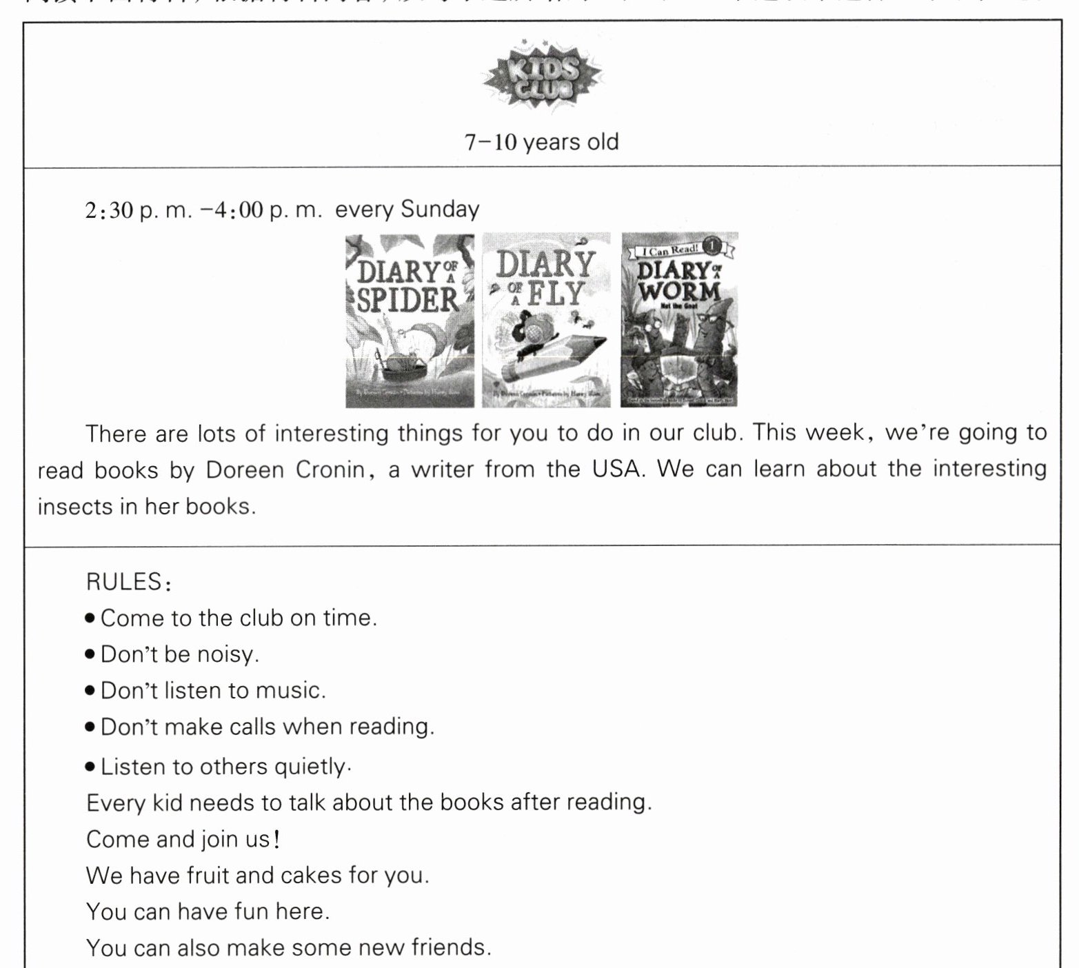 | There are lots of interesting things for you to do in our club. This week, we're going to read books by Doreen Cronin, a writer from the USA. We can learn about the interesting insects in her books. |
