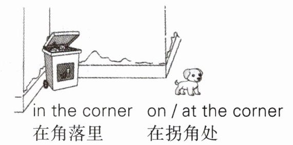 探究:in the corner 指某空间内部的角落,而 on / at the corner 指外部的转角处。如:④