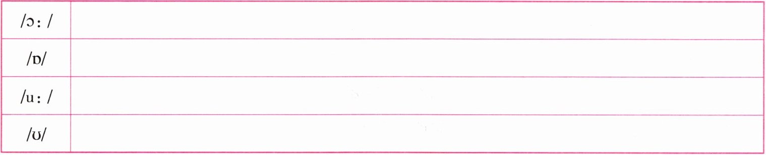 /ɔ:/ important hall whiteboard corner/ɒ/ modern office locker across/u:/ shoe room who food/ʊ/ put book football full