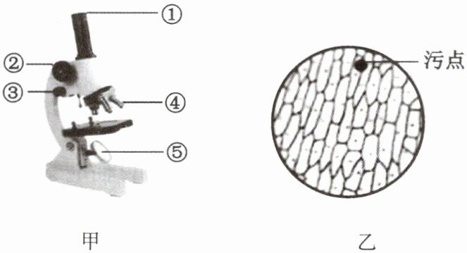 19. 实验课上,丽丽制作了洋葱鳞片叶表皮细胞临时装片,并用如图甲所示的显微镜观察,观察到的视野如图乙。丽丽确定此污点在临时装片上,将污点最快移出视野以及将此视野调节得更加清晰的方法分别是( )