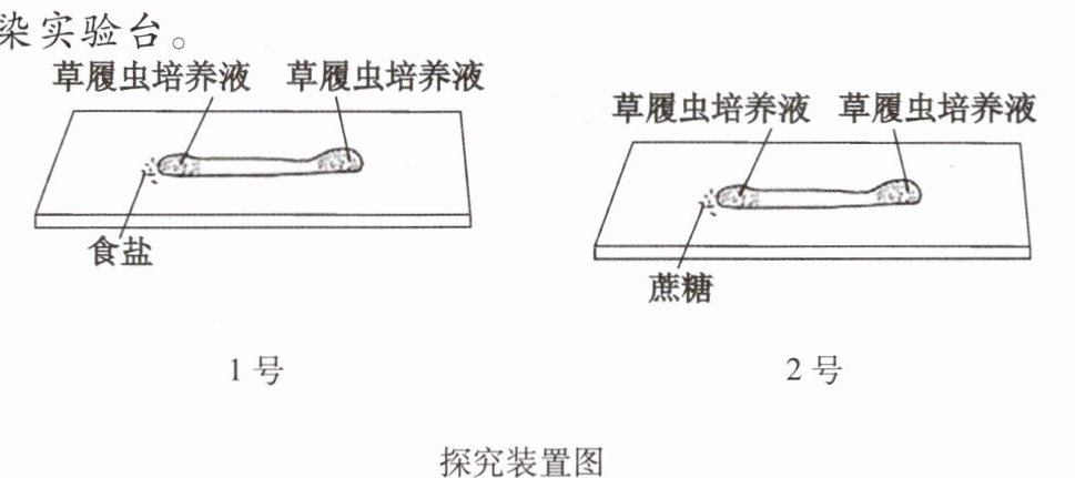 1号载玻片上加入食盐粒后草履虫大多向______侧移动,即向______食盐的一侧移动。2号载玻片上加入蔗糖后草履虫大多向______侧移动,即向______蔗糖的一侧移动。