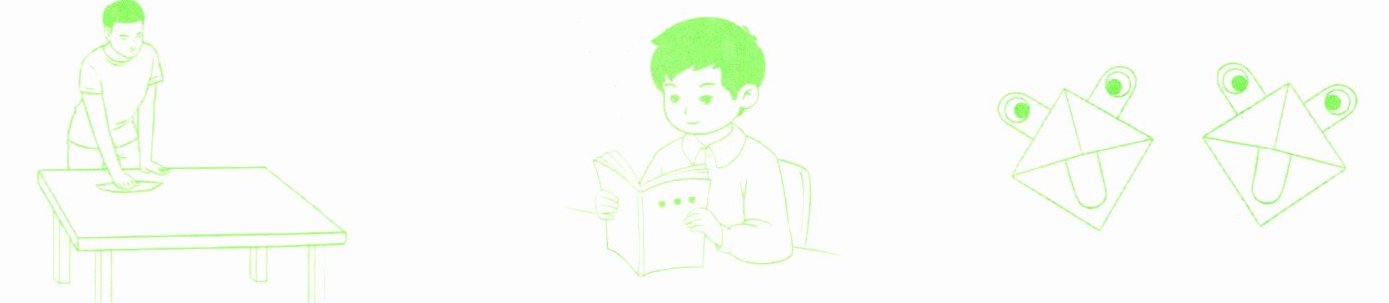 爸爸在擦桌•___子。 哥哥在读书•___。 我喜欢折纸•___。