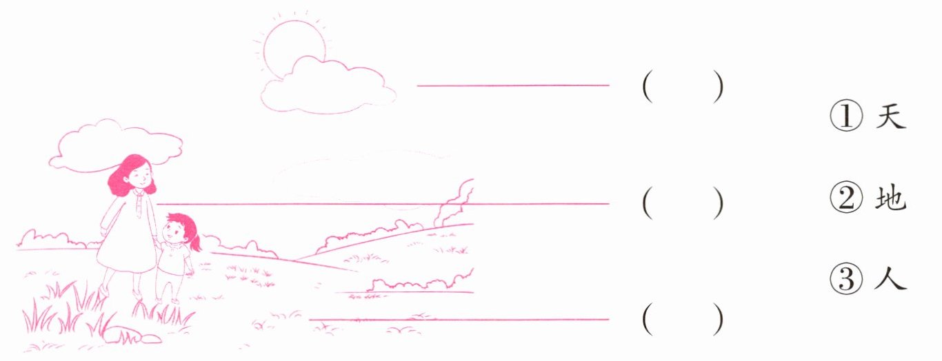 在“朵朵的天空”的“天”字、“大地妈妈”的“地”字上画○;( )( )(√)( )