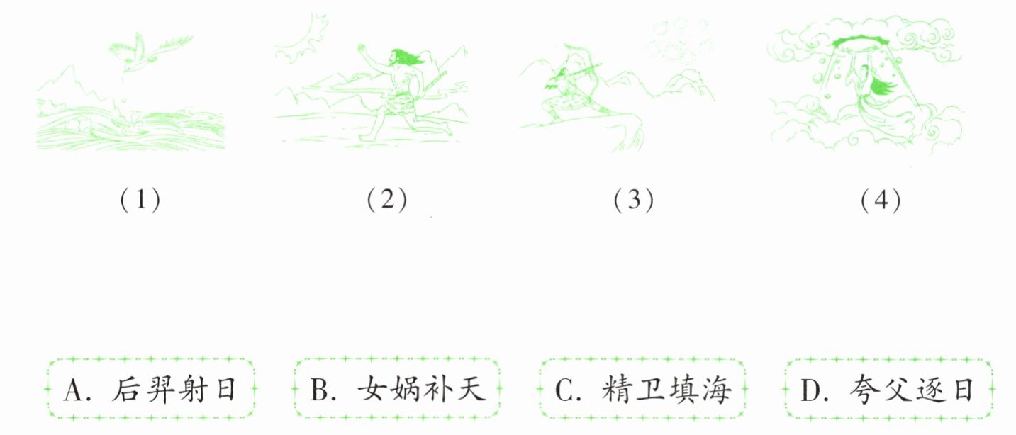 2. 看看下面的图片,猜猜它们是什么神话故事,并连一连。